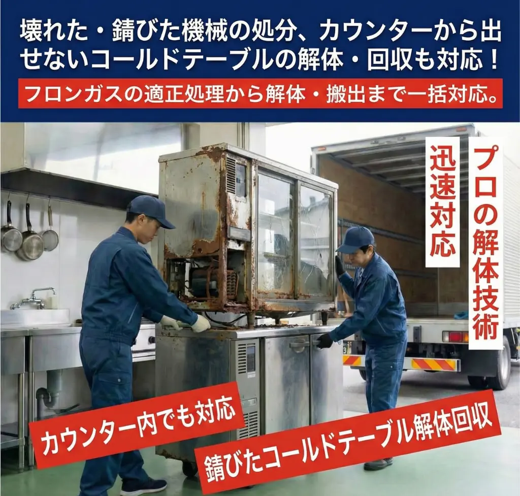 “動かない・冷えない・錆びている”業務用冷蔵庫やコールドテーブルの処分にお困りではありませんか?
