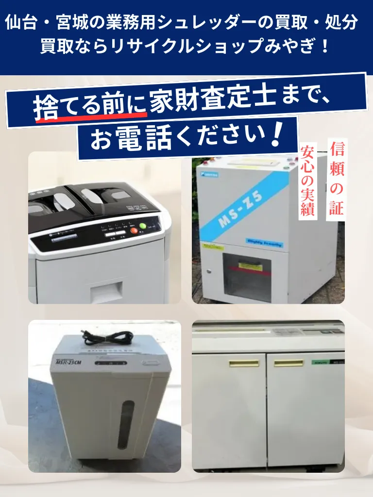| 高価買取 (プラス査定) | ・製造から5年以内 ・明光商会(MSシュレッダー)製品 ・スパイラルカット方式(セキュリティレベルが高い) ・動作正常、チップボックスの割れがない |